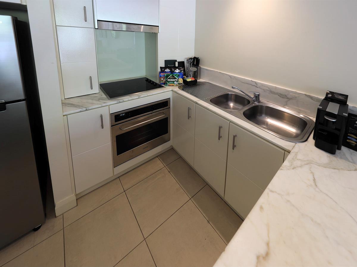 - A fully equipped kitchen with marble benchtops